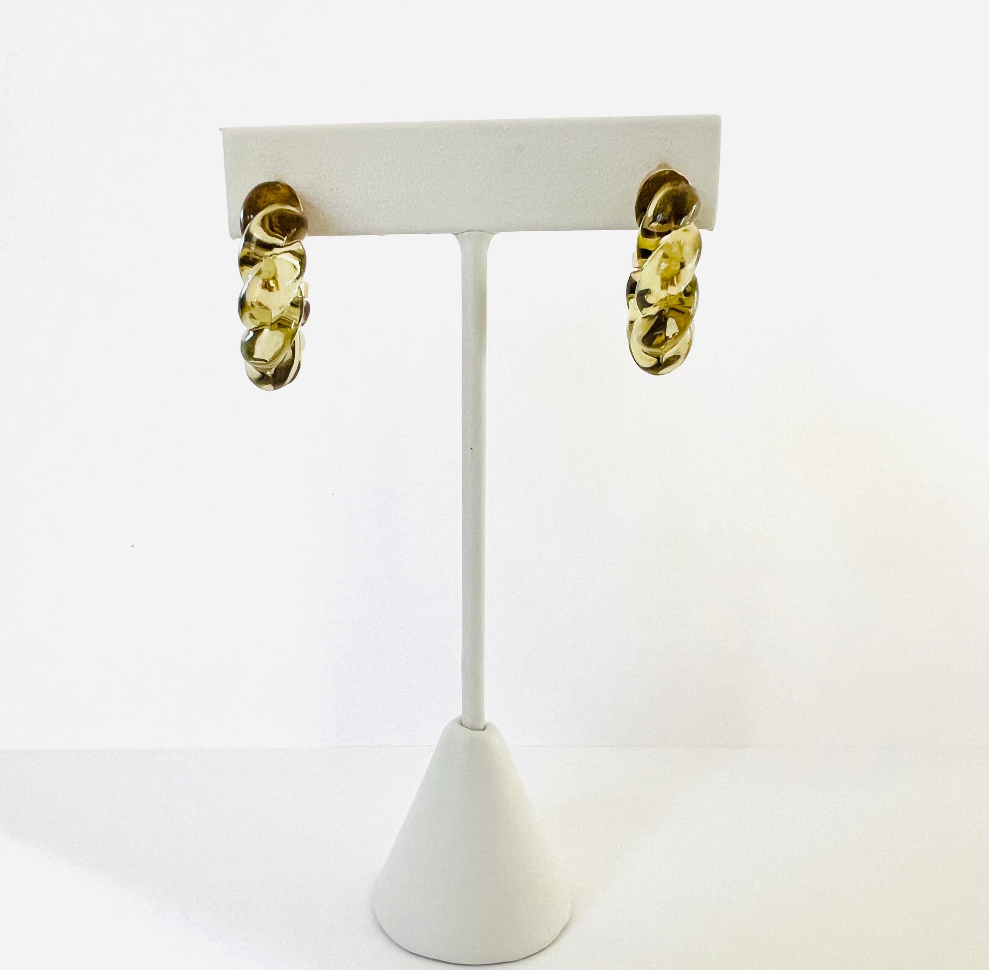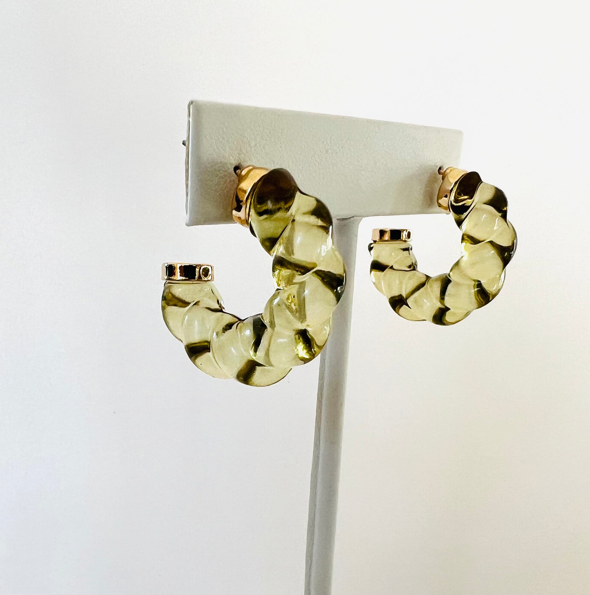 Elegant twisted acrylic hoops with gold plated caps.