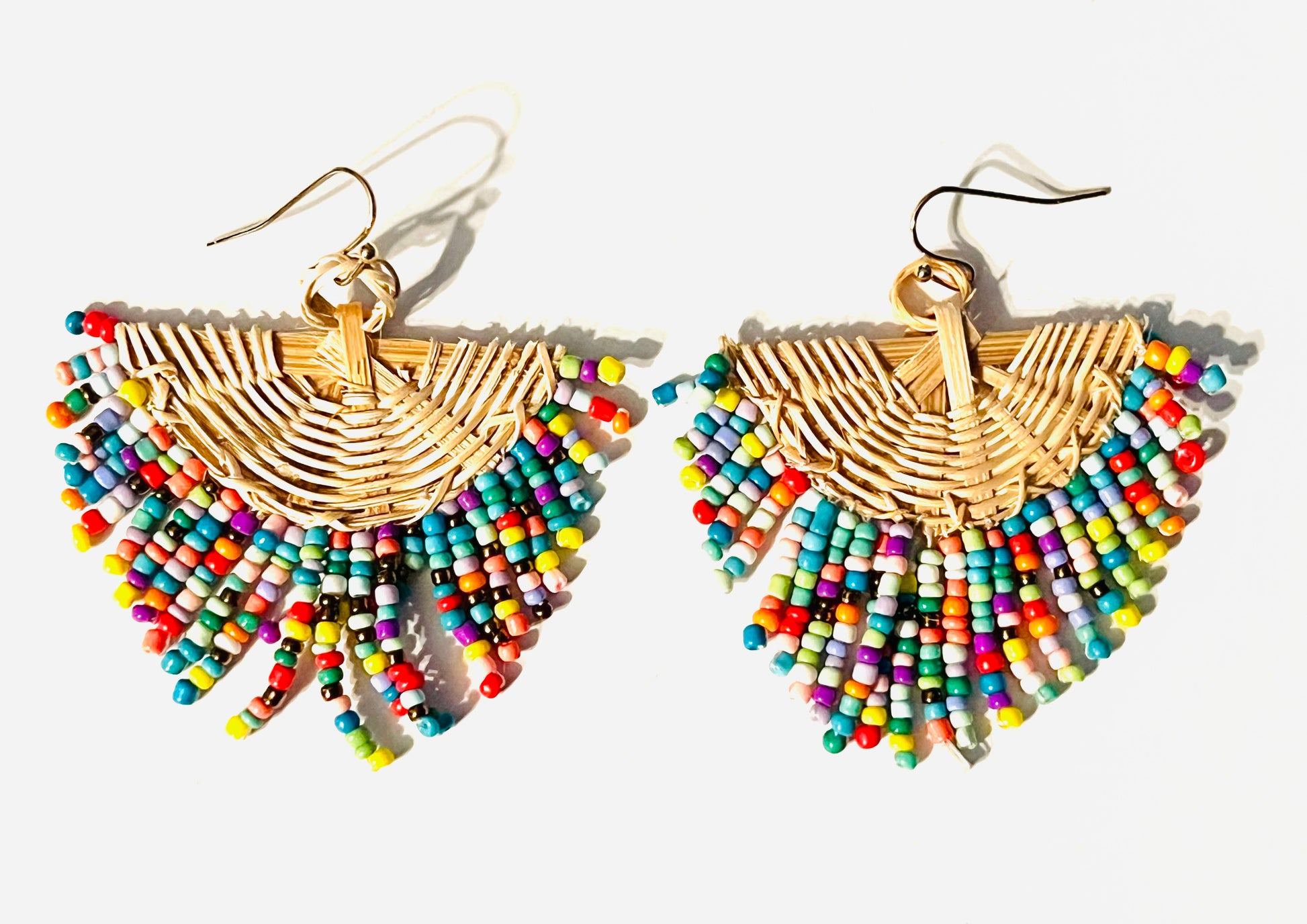 🌴 Bring those beachy vibes wherever you go! These handmade earrings feature a beautiful tan basket weave pattern adorned with playful multicolor beads that catch the light with every move.