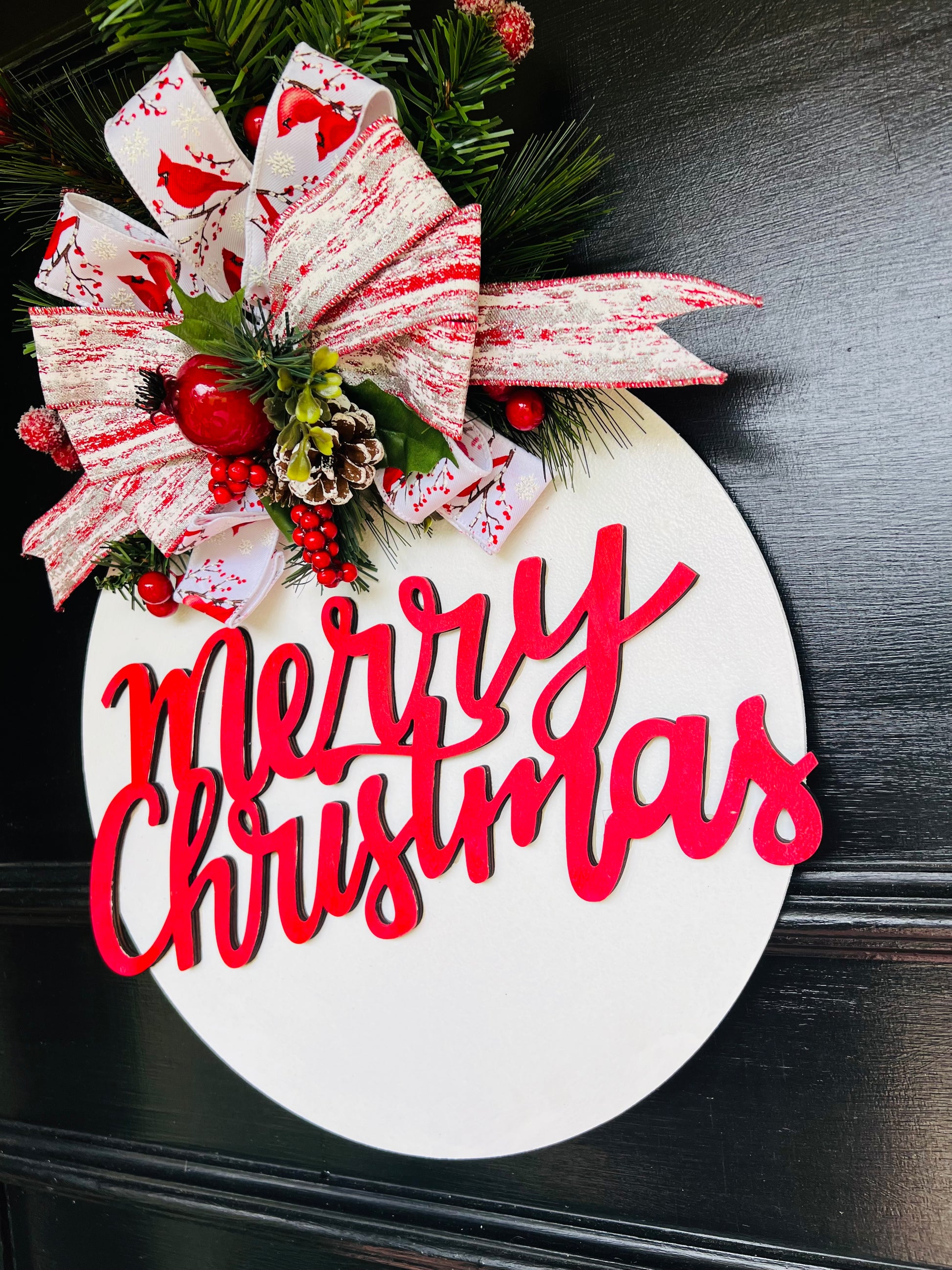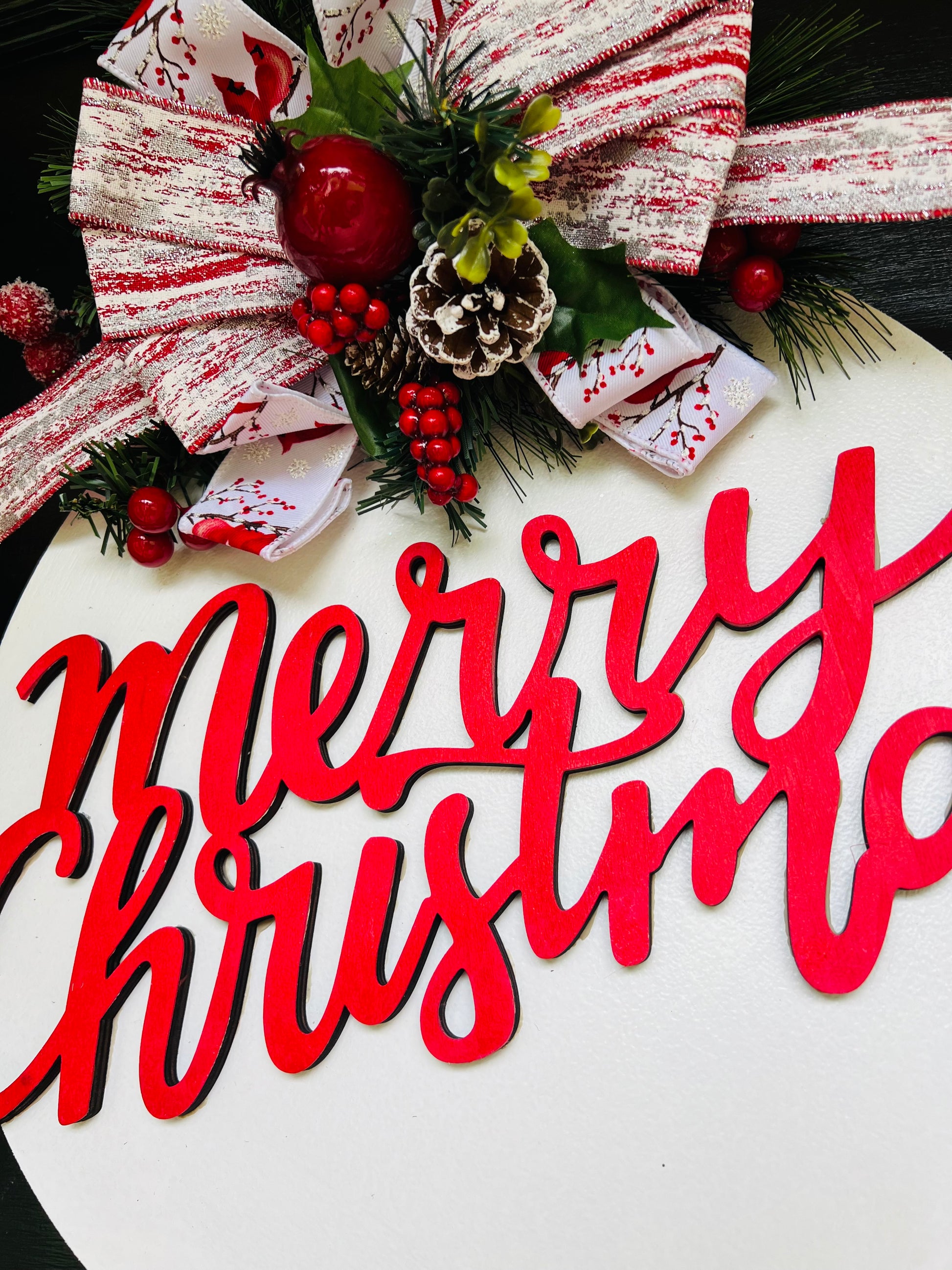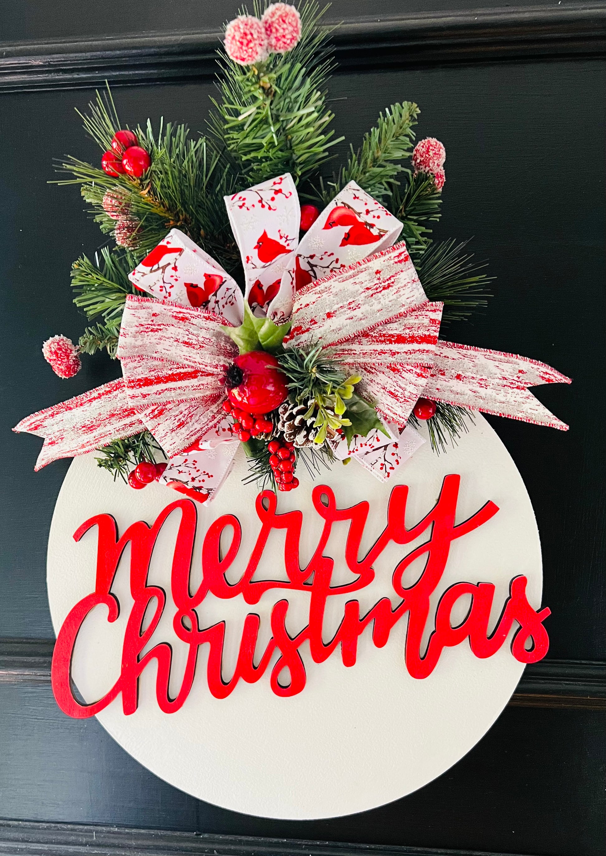 This delightful Merry Christmas door hanger captures the joy of the season with its bold red lettering, vibrant greenery, and frosted accents. The show-stopping bow features beautiful red cardinals and sparkling touches that instantly brighten your entryway. Whether on your door or inside your home, this wreath brings warmth and Christmas spirit to any space.