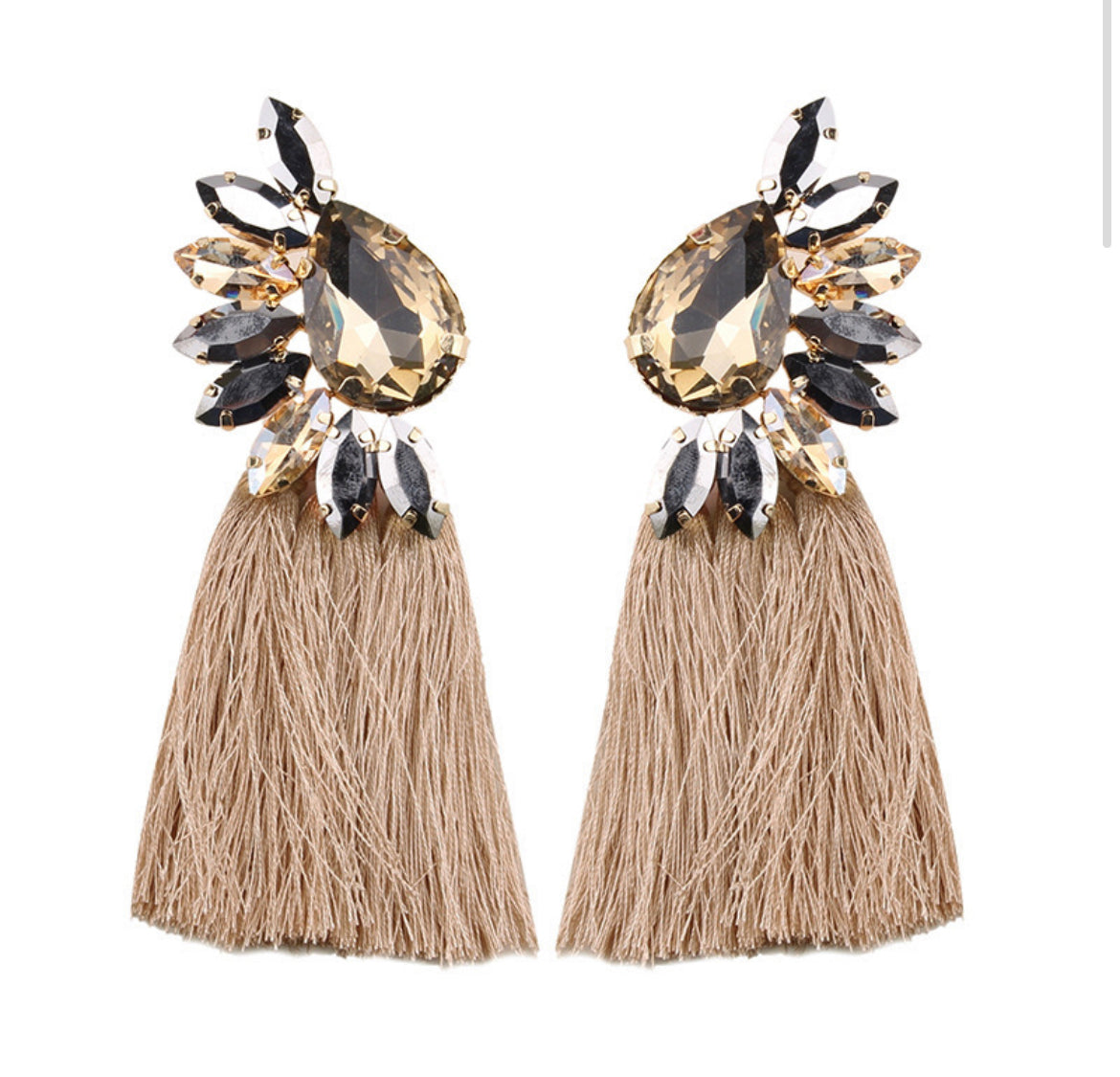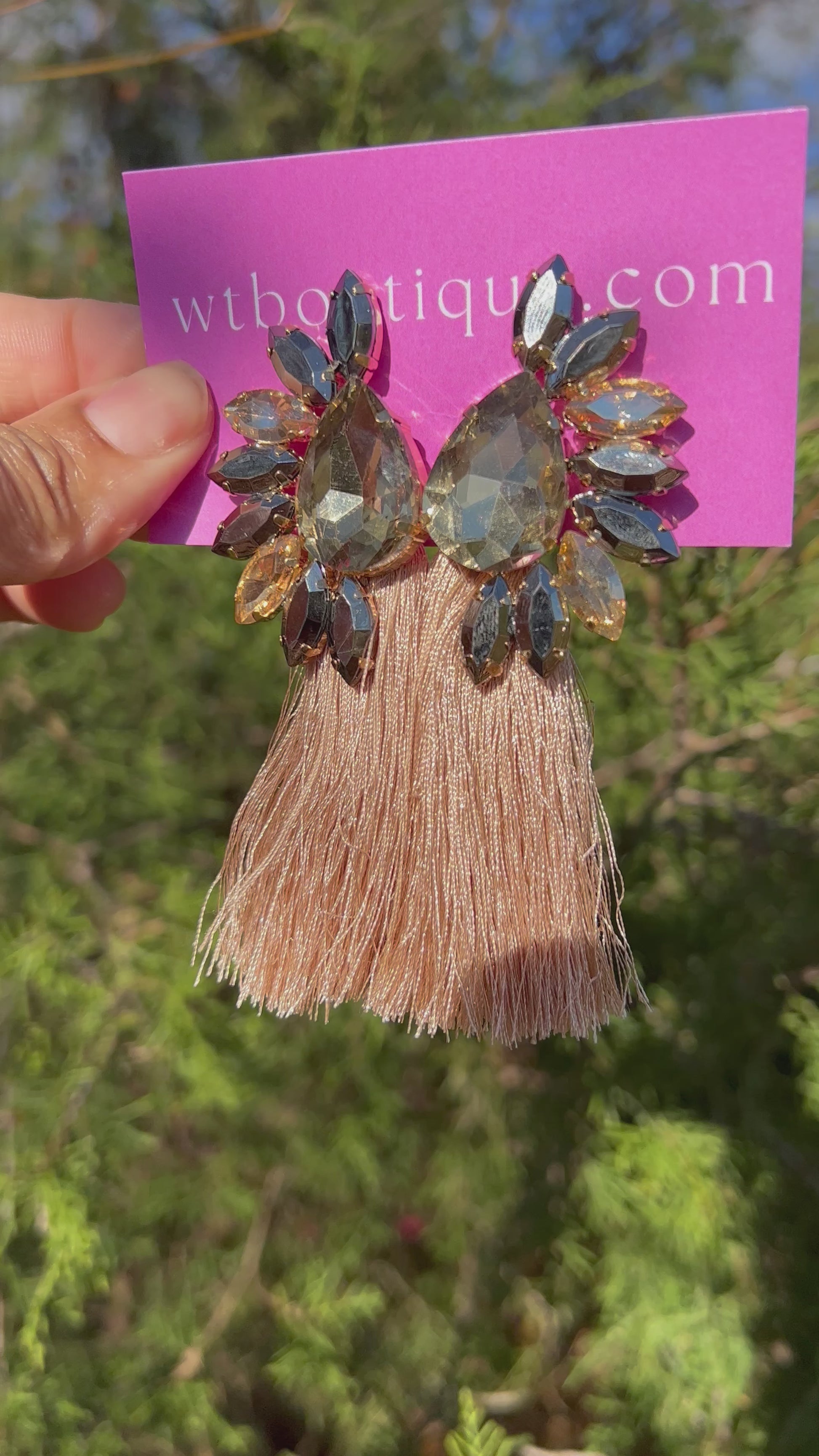 These coffee-colored tassel earrings will bring your next evening look to life. The tassel’s move effortlessly and the rhinestones sparkle when you walk into a room.