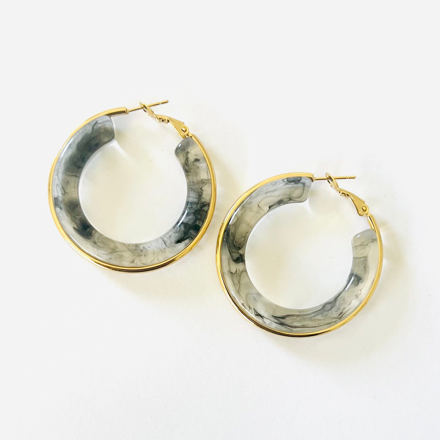 These darling hoops are chic and simplistic! The 18k gold plated accent centered along the entirety of the acrylic hoop offers a classic style to this pair.