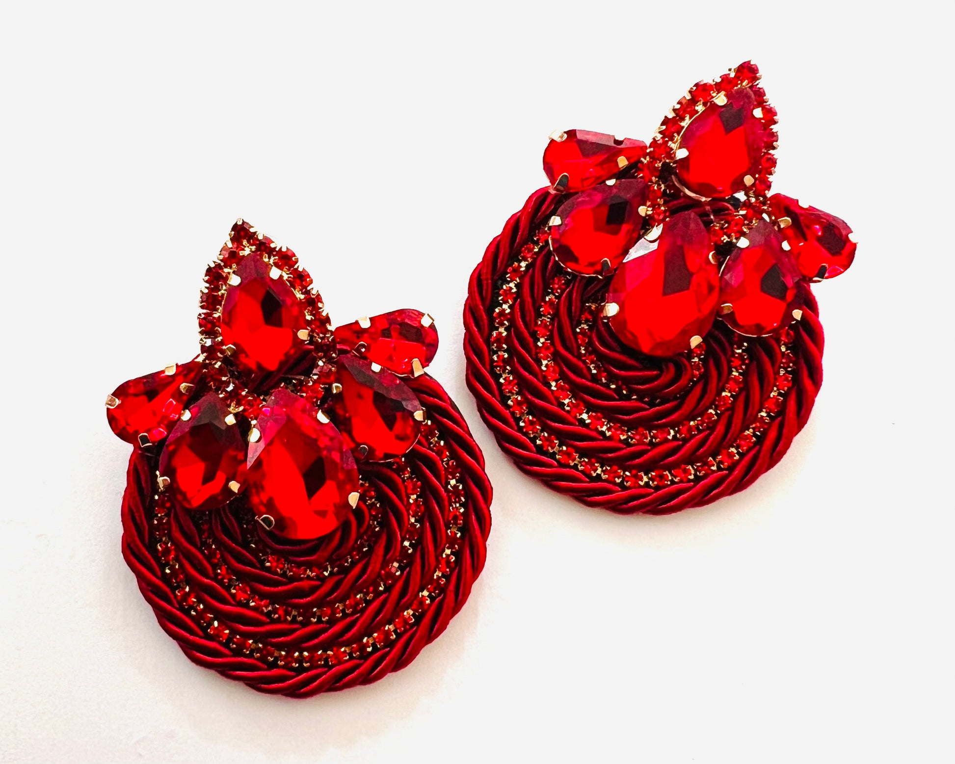Oversized red rhinestone studs with satin corded accents. These beauties are meant to leave a bold statement!