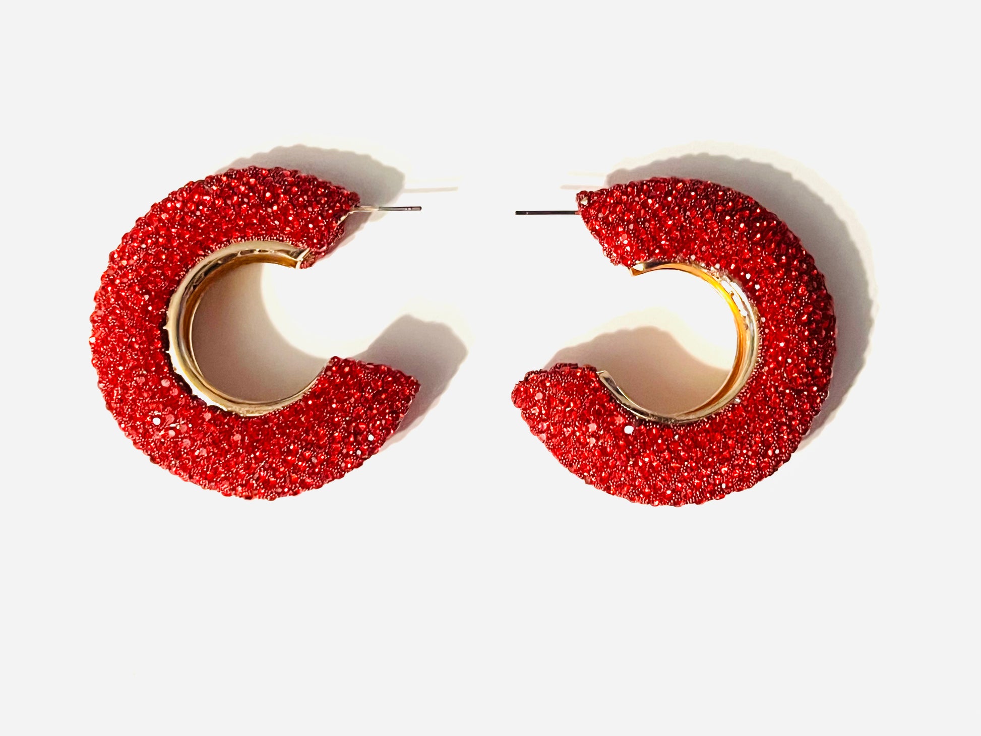 These eye-catching hoops feature brilliant red rhinestones beautifully accented with luxurious gold details. Perfect for adding a touch of glamour to any outfit, these earrings are designed to turn heads and showcase your confident style.