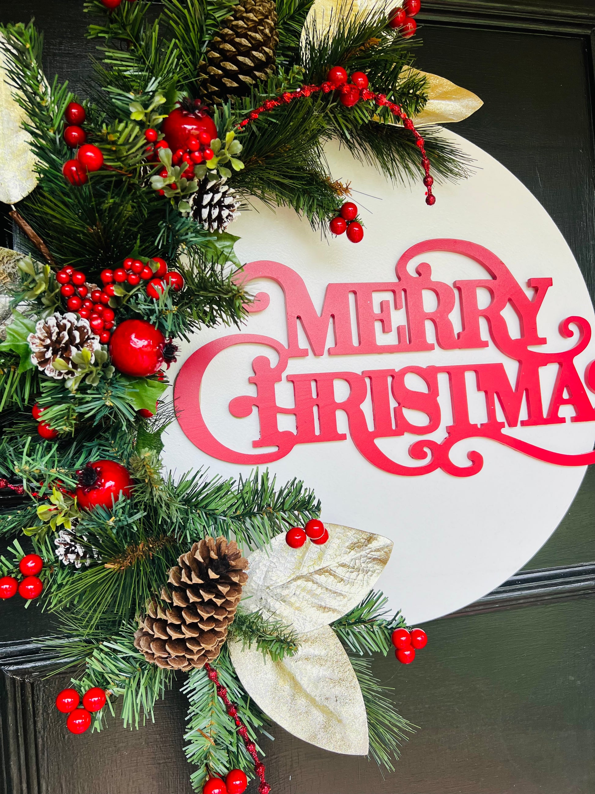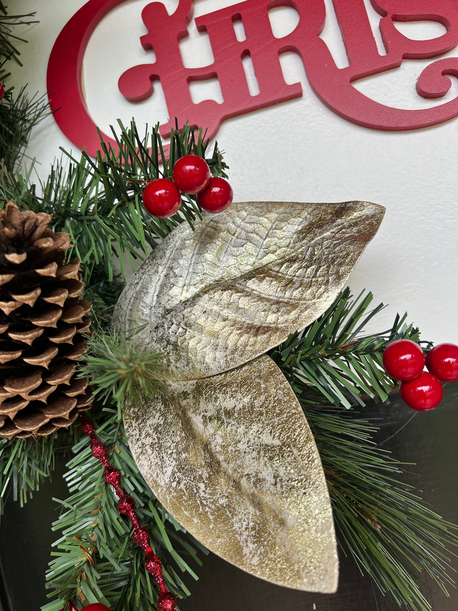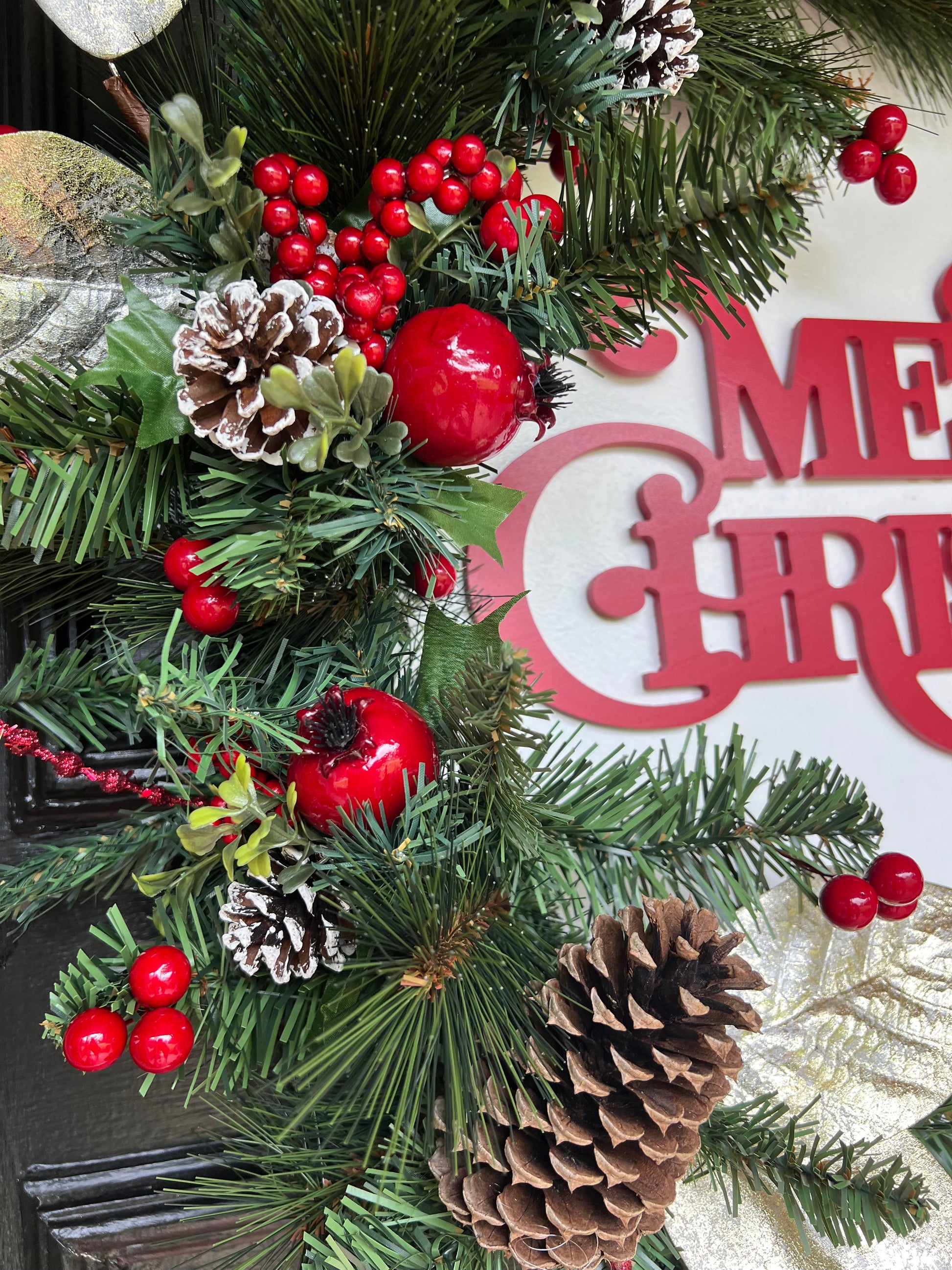 Celebrate the season with this elegant Merry Christmas wreath that brings warmth and cheer to your home. Designed on a white round base, it features lush Norfolk pine greenery, natural eastern North Carolina pinecones, bright red berries, and shimmering gold magnolia leaves that add a touch of luxury. Perfect for your front door, mantle, or entryway — this handcrafted wreath spreads festive joy all season long.